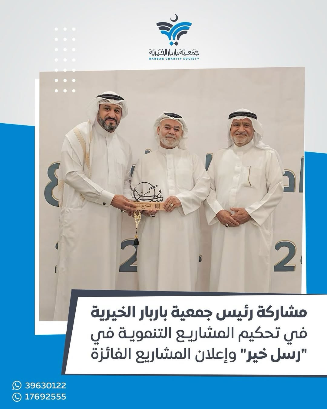 شارك رئيس جمعية باربار المهندس السيد علي سبت في حفل تكريم المشاريع التنموية *رسل خير* وإعلان المشاريع الفائزة وذلك يوم الأربعاء ٢٤سبتمبر٢٠٢٥ في صالة أحمد كانو بمدينة حمد